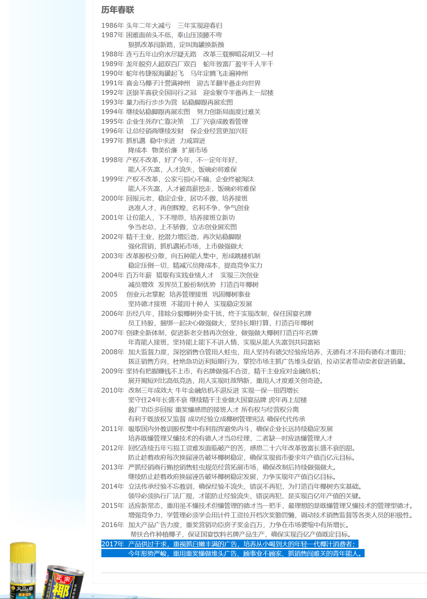 澎湃新闻注意到,椰树集团官网在“企业文化”一栏中公布该集团的历年春联。2017年的春联写着:“产品供过于求,重视抓白嫩丰满的广告,培养从小喝到大的年轻一代椰汁消费者;今年形势严峻,重用重奖懂做堆头广告、顾事业不顾家、抓销售闯难关的青年能人。”