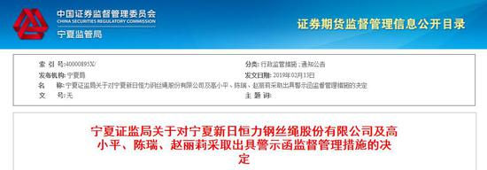 宁夏证监局表示,根据《办法》第五十八条、第五十九条规定,决定对新日恒力及高小平、陈瑞、赵丽莉采取出具警示函的监督管理措施并计入证券期货市场诚信档案。