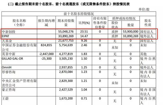 截止2018年12月31日,公司第一大股东中新创投累计质押公司股份5390万股,占其持有公司股份的97.91%,占公司总股本的23.01%。第二大股东EIPAT累计质押公司股份3389.03万股,占其持有公司股份的100%,占公司总股本的14.47%