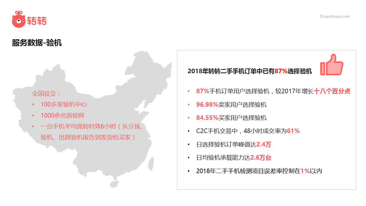 转转已在全国设立100多家验机质检中心,拥有1000多名验机质检工程师,验机的准确率大幅提升,质检项目的误差控制在1%以内。数据显示,2018年转转平台的手机交易订单中,已有超过87%的用户选择了平台提供的验机服务,和2017年的69%相比,也出现大幅增长。