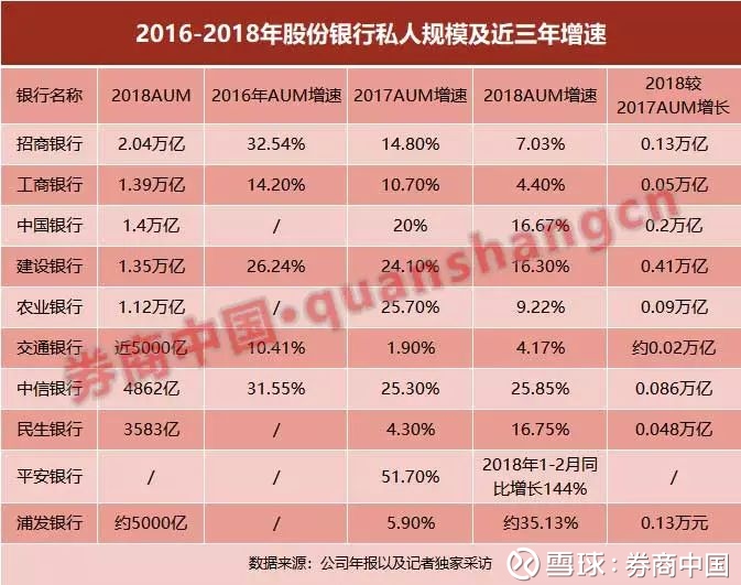 虽然2018年招行、工行、农行、建行和中行五家银行的私行AUM增速放缓,但是,一批股份行私人银行业务却身处扩张快车道,成绩格外亮眼。