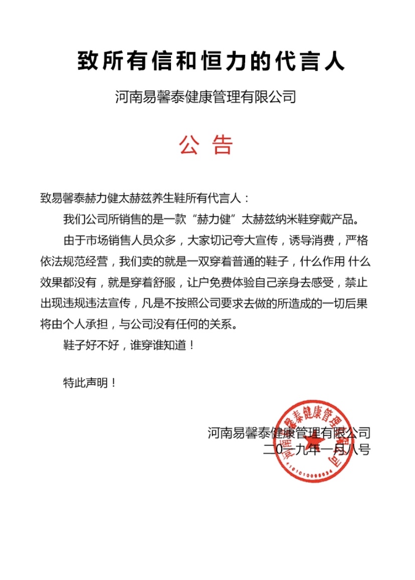 澎湃新闻注意到,“易馨泰”公众号曾于2019年1月发布一份公告称:“我们卖的就是一双穿着普通的鞋子,什么作用什么效果都没有,就是穿着舒服。”公告还称,“禁止(代言人)出现违法违规宣传,凡是不按照公司要求所造成的一切后果将由个人承担,与公司没有任何关系。”