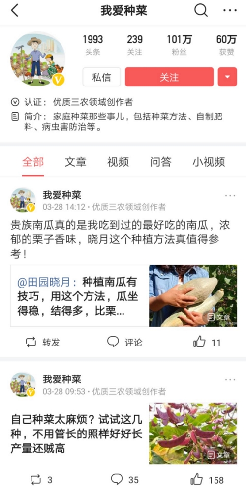 “我爱种菜”在今日头条和西瓜视频平台上,以短视频、图文形式,向大家普及了很多农业种植知识、技巧,为网友开辟了种菜新大陆,受到百万网友喜爱。
