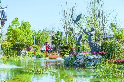 福建园以三坊七巷剪影墙、亭台水榭、人物雕塑为主景,让游客感受到福建深厚的文化韵味和独特的园林艺术。 本报记者 潘之望摄