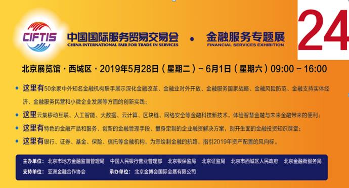 千龙网北京5月23日讯 2019年5月28日至6月1日,2019中国国际服务贸易交易会在京举行。期间,以“深化金融改革 扩大对外开放 推动经济高质量发展”为主题的2019中国国际服务贸易交易会—金融服务专题展(以下简称“2019年京交会金融服务展”)将在北京展览馆开幕,共有银行、基金、证券、保险、金融科技企业等五十余家具有行业代表性的国际国内金融机构集聚一堂,展示金融服务实体经济,金融业改革创新、金融科技创新等方面的成果。