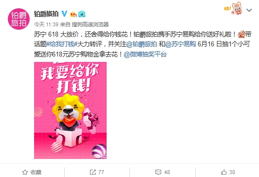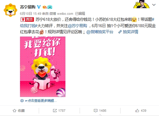 6月10日,苏宁易购官方微博发起了#给我打钱#的话题活动。“苏宁618大放,还舍得给你钱花!小苏的618大红包来了!”。只要带话题#给我打钱#,关注苏宁易购的微博、转发评论,就有机会获得6180元的现金红包。6月16日18点,6180元现金将直接发放到幸运锦鲤的苏宁易购账户中。