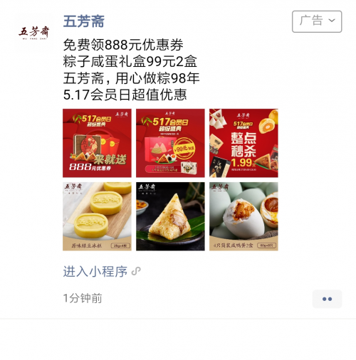 除了激活已有会员消费,端午前后期也是五芳斋拉新客的最佳时机。一般的户外广告或促销单页,只能吸引顾客到店消费一次,难以沉淀。因此,今年五芳斋尝试了通过有赞投放朋友圈广告。