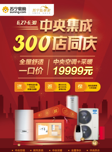 据悉,本次300店同庆活动,线上线下同步进行。线上以苏宁易购集成家电商城为主阵地,线下涵盖全国300多家中央集成厅,全国联动,全屋舒适一口价,并推出多重惠购活动。