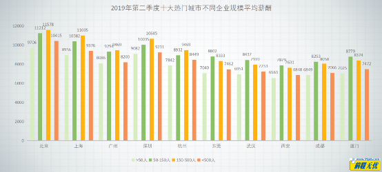 对企业而言,薪酬是企业经营、人才吸引与保留的战略要素。数据显示,2019年第二季度人数规模小于50人企业薪酬不足万元,企业规模小于50人企业往往是小微企业,资金规模有限,整体抗风险能力较弱,其薪酬竞争力相对较低。
