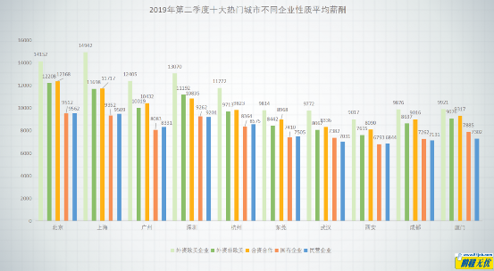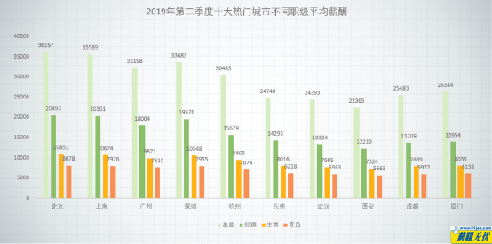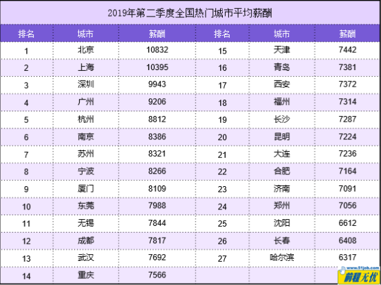 2019年第二季度大部分城市间薪酬较上一季度略有下降