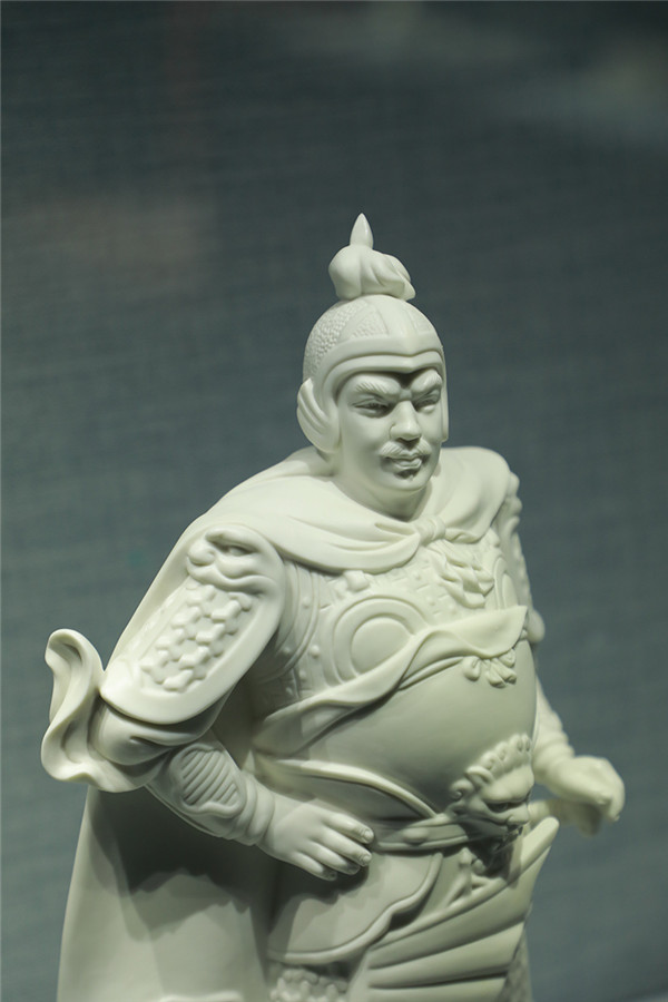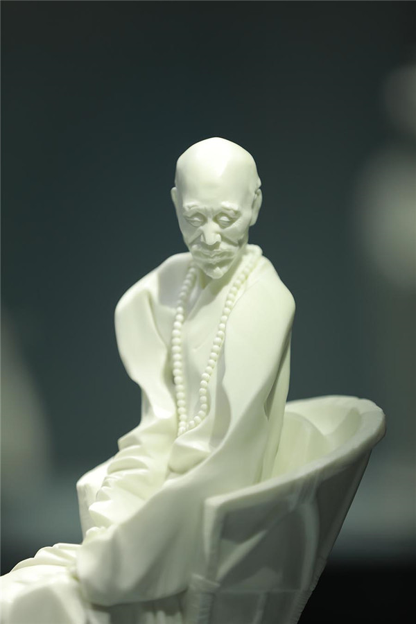 第二,我非常欣是,颜松柳对“中国白”的爱。德化最大优势就是材料优势,德化的瓷塑为什么做得这么好?就是得益于德化的材料。就像北方人吃面一样,更筋道,德化的材料比较适合塑形,其他产区的材料往往不具备这个特点。我说为什么你们喜欢彩绘?可能因为你们材料上有先天的不足,因不足而饰之,因为材料有缺陷才在上面不断地画,用材料掩盖材料的缺陷。德化没有,德化是最好的材料,很筋道,能塑形,很多飘逸的形状都可以塑造出来,我觉得材料有特殊的表现。“中国白”很传统很历史,这就是经典。德化的瓷塑也好,我觉得还是要在尊重材料的基础上,不破坏材料的基础上去做一些创造。所以,颜松柳的创作,对材料掌握得非常好。
