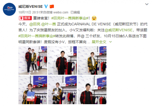 这是CARNAVAL DE VENISE(威尼斯狂欢节)首次签约明星,也是田亮叶一茜夫妇首次合体代言时尚服饰品牌。