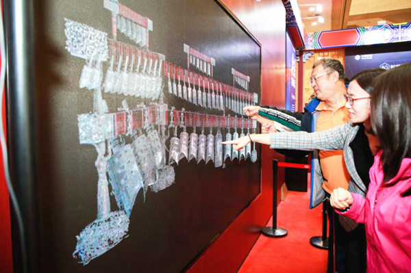 在全息体验区,观众手持钟锤凌空敲击,显示在LED屏中的曾侯乙编钟就能通过专门的感应装置跟随敲击而摆动,并发出对应的乐音,让观众“变身乐师”。