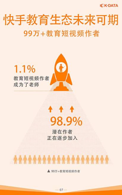 快手教育生态的内容作者已经超过99万,1.1%的人成为付费课程的老师,这意味着,还有98.9%的空间等待潜在作者逐步参与、凭借知识获得收入。在快手,知识很值钱,技能不闲置,智慧不白费,每一个慷慨分享知识的人,都能得到应有的回报。