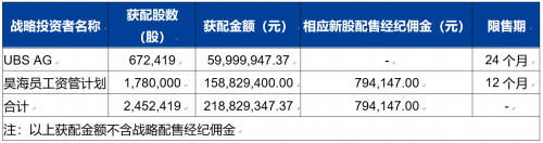 昊海生科此次发行的发行规模在10亿元以上、不足20亿元,根据《业务指引》规定,瑞银证券的跟投比例为本次公开发行股票数量4%、但不超过人民币6,000亿元。瑞银证券已足额缴纳战略配售认购资金,本次获配金额59,999,947.37元,共获配672,419股,占比3.78%。
