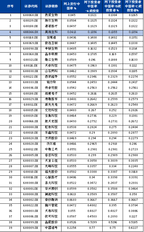10月22日晚间,首家“H+科创板”生物医药企业昊海生科(688366.SH)发布了科创板上市网下初步配售结果及网上中签结果公告。公告显示,本次发行网上发行最终中签率为0.04134457%,是目前40家已经公布网上发行中签率结果的科创板公司中最低的,网上申购中签号码共有12,254个。此外,此次共计279家网下投资者管理的3,731个配售对象按要求进行了网下申购,网下初步配售比例只有约0.1355%,位列39家已经公布网下配售结果的科创板公司中第四低位。无论是网上发行还是网下配售,昊海生科无疑都受到了投资者的青睐。