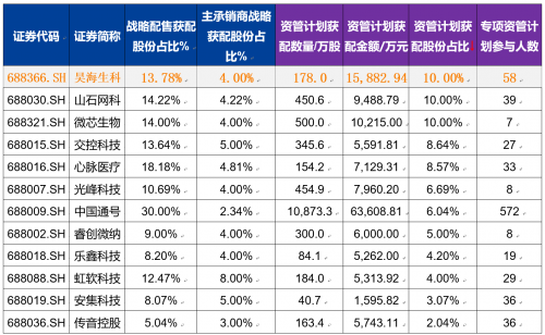 截至10月22日,科创板已经有44家公司公布了上市发行公告,其中通过高管核心员工专项资产管理计划参与战略配售的有12家,占比27.27%。12家公司专项资管计划获配数量占发行量的平均占比为6.52%,其中顶格10%申购的有昊海生科、微芯生物、山石网科三家。资管计划的平均参与人数为72人,剔除中国通号(572人)后,平均参与人数约为27人,昊海生科资管计划的参与人数排名第二,为58人。