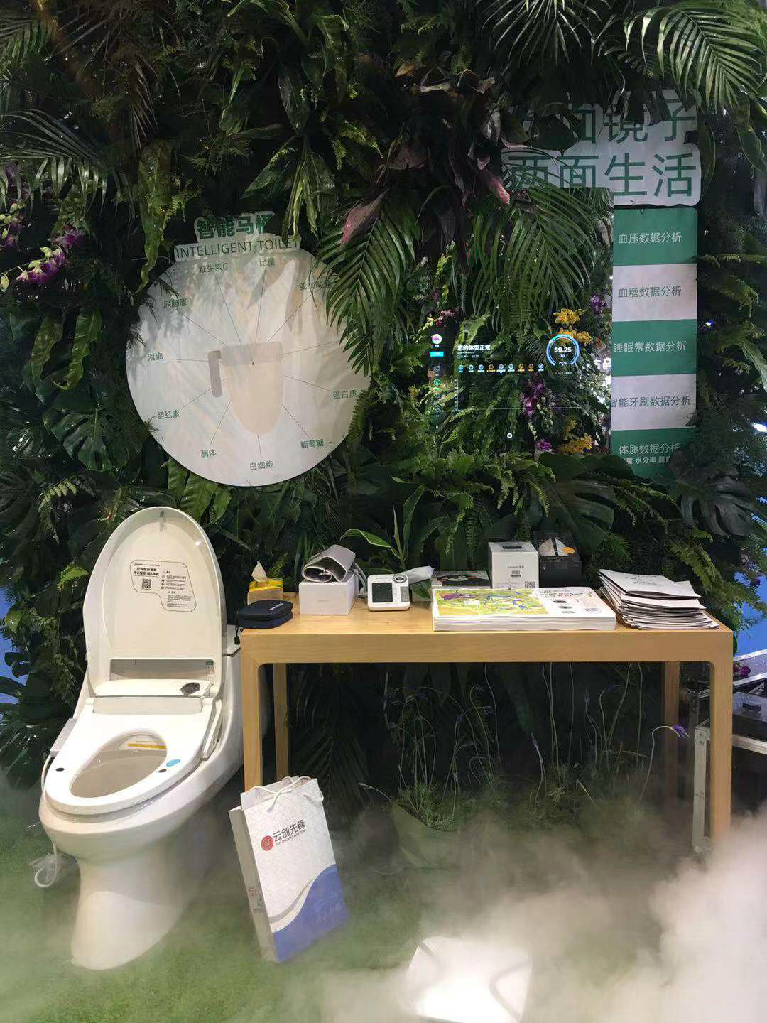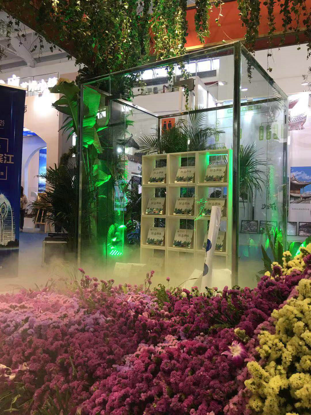 整个场馆我们分为三个部分,通过左中右三个分区对应勐巴拉文旅、普洱茶产业和康养的小镇布局,而整体元素当中又通过雨林中若隐若现的傣族建筑风格进行联动和穿插,还原雨林郁郁葱葱、鸟语花香的本来面目;同时,在文旅部分,通过孔雀花海、电子大屏、一机游直播、超声波造雾等方式直接的呈现了人间仙境勐巴拉在一天之中的真实景象,所见即所得首次用在了对环境的呈现上;在普洱茶产业部分,由于勐巴拉普洱茶小镇将于2020年开建,很多理念的呈现需要采用一种具象和抽象的结合,所以现场通过布置一个雨林仙境中的茶台,结合现代感较强的透明茶叶银行,给参观者充分的想象空间,虚实结合,较好的表达了勐巴拉普洱茶小镇全产业链的布局;康养部分,本次我们运用了最先进的智慧镜+智慧马桶+智能生活康养仪器(包括智能肌肤仪、智能血压计、智能生态体重仪、智能牙刷等),数据都能通过平台互联并呈现在智慧镜上,给人以最直接的智能数据化康养体验,结合勐巴拉3000+的负氧离子和12500亩雨林、32个湖泊的优良环境在展会上的呈现,完美的诠释了在最优秀的环境里康复养生的健康生活目的地的深刻内涵。