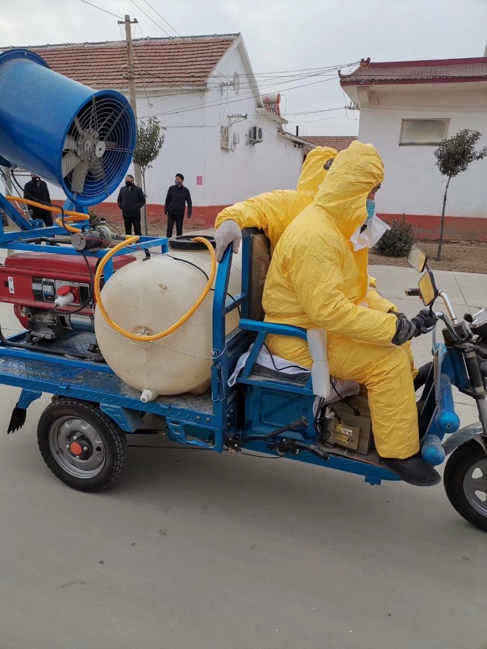 山东省齐河县胡官屯镇农业科技试验示范基地成立了15人组成的疫情防控志愿防疫服务队,出动无人机、轮式机等机械600余架“台”次,完成全镇40余个村的消毒防疫工作,对全镇进行全方位的消毒防疫。