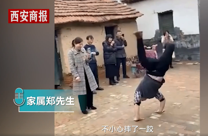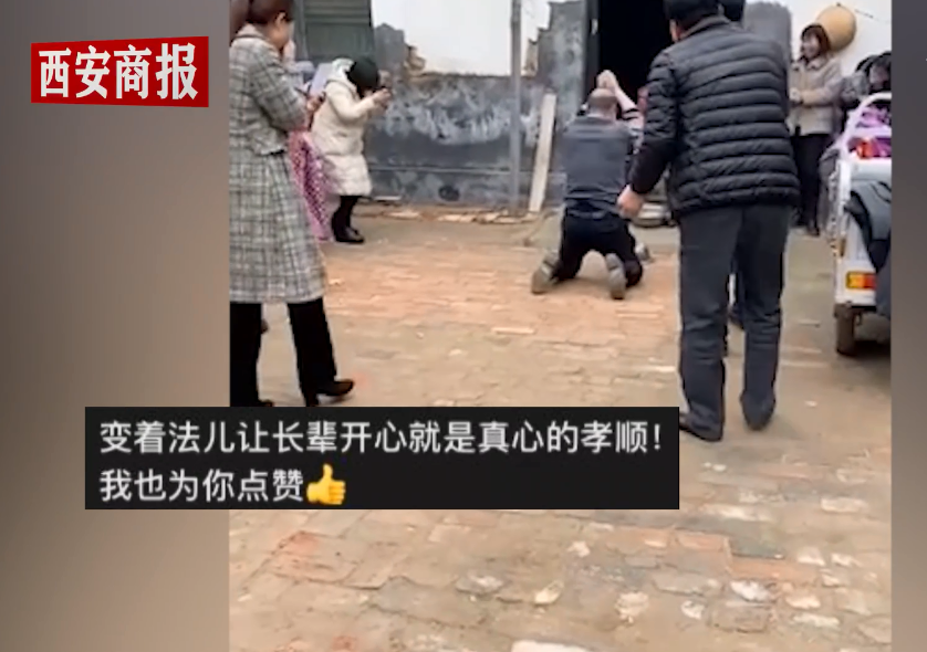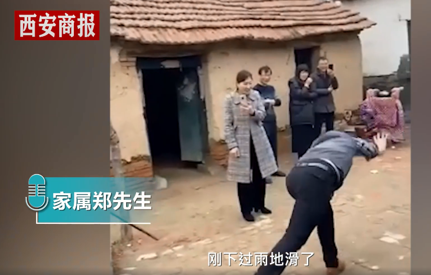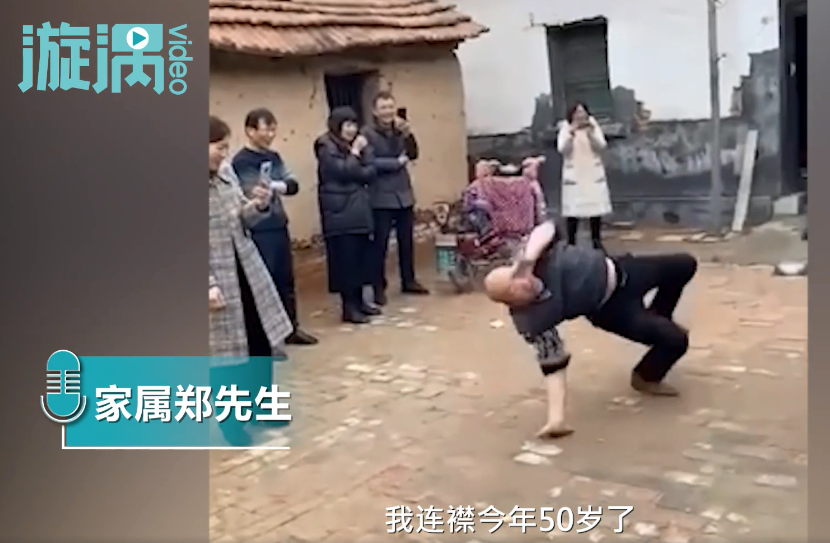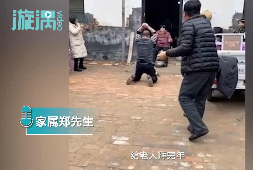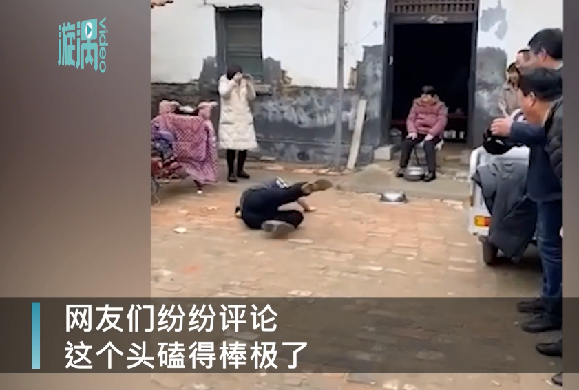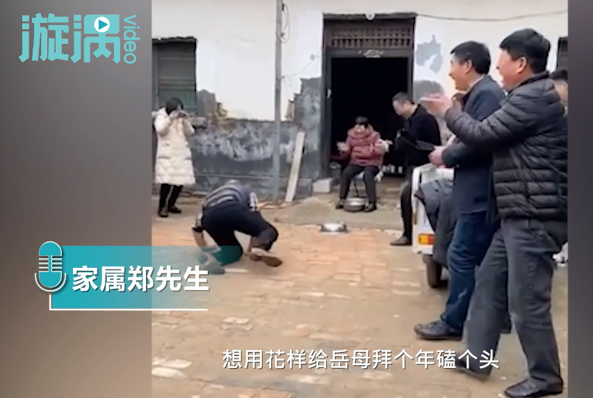 2月14日,在山东菏泽,50岁男子翻跟头给岳母拜年摔倒,爬起来跪在岳母面前磕头 。家人郑先生称,当天下雨了,地上比较滑,所以摔倒了,站起来之后坚持给岳母磕头拜年,老人很开心。