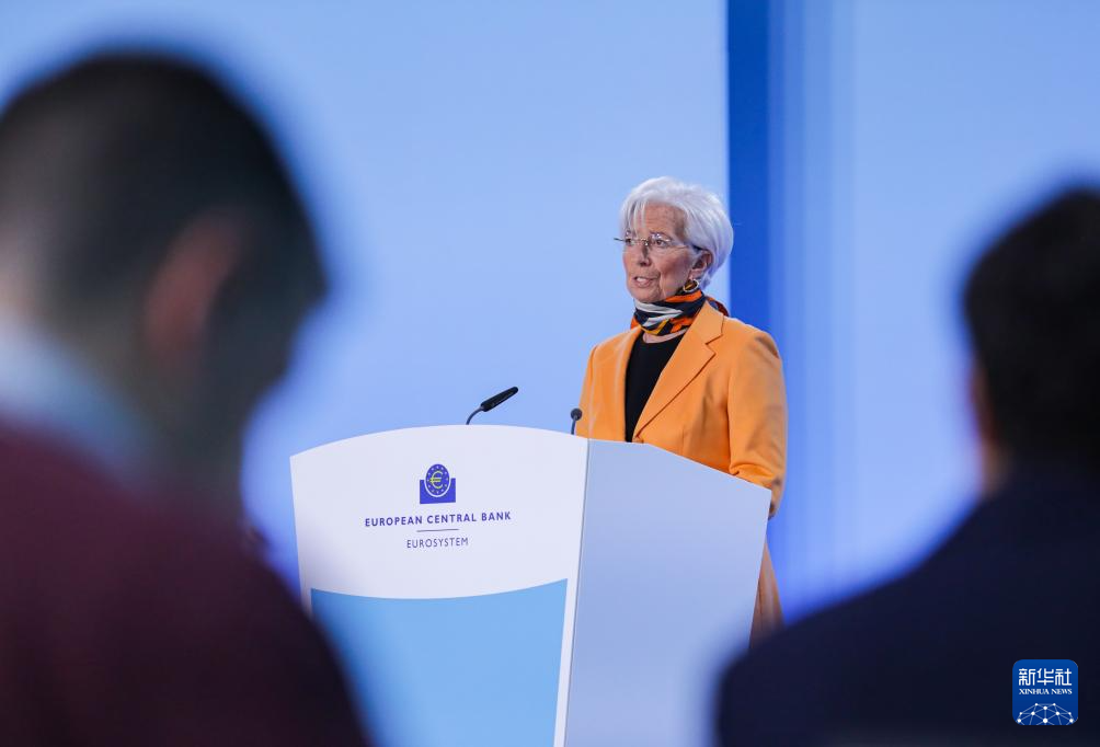 3月6日,欧洲中央银行行长拉加德在德国法兰克福欧洲央行总部举行的新闻发布会上讲话。新华社记者 张帆 摄