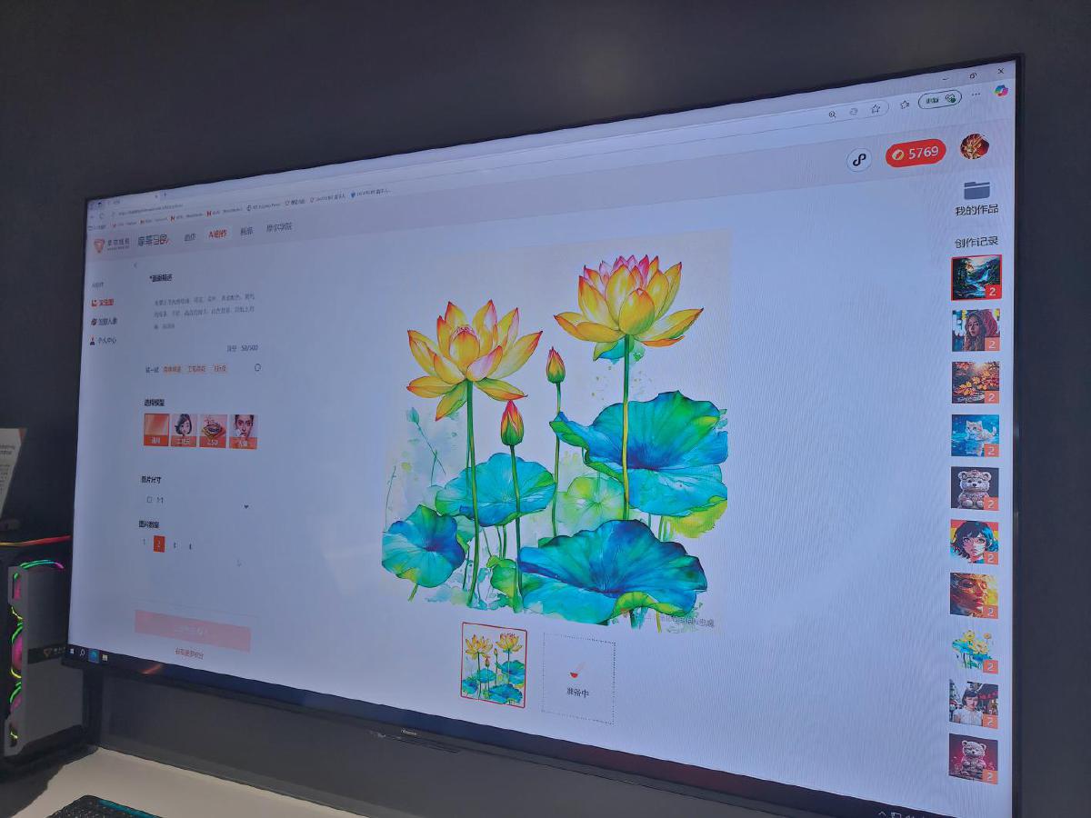 在展厅现场,工作人员输入了50字的文字描述,包括“水墨工笔风格绘画,荷花,荷叶,黄蓝配色,简约的线条,白色背景”等,收到指令后,摩笔马良立刻开始创作,很快一幅精美的荷花图跃然于屏幕。