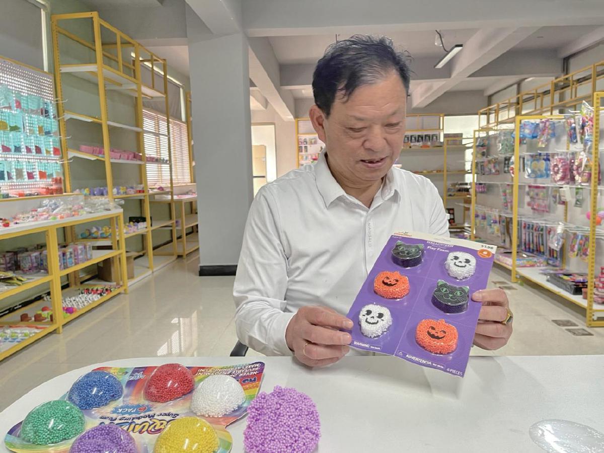 义乌市梦成玩具公司负责人成正仁介绍工厂所生产的玩具。