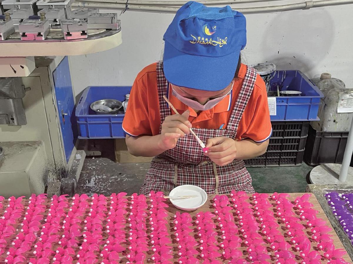 义乌市梦成玩具公司的工人正在制作产品。