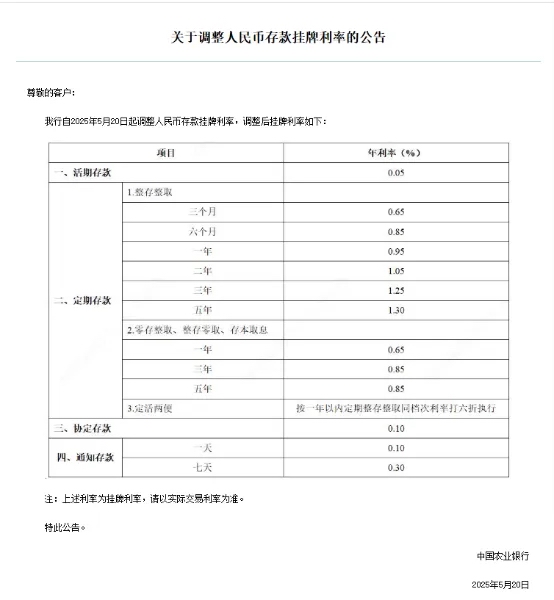 农业银行于5月20日下调人民币存款利率,其中活期利率下调5个基点至0.05%;定期整存整取三个月期、半年期、一年期、二年期均下调15个基点,分别为0.65%、0.85%、0.95%、1.05%;三年期和五年期均下调25个基点,分别至1.25%和1.3%。定期零存整取、整存零取、存本取息三种期限均下调15个基点。7天期通知存款利率下调15个基点至0.3%。