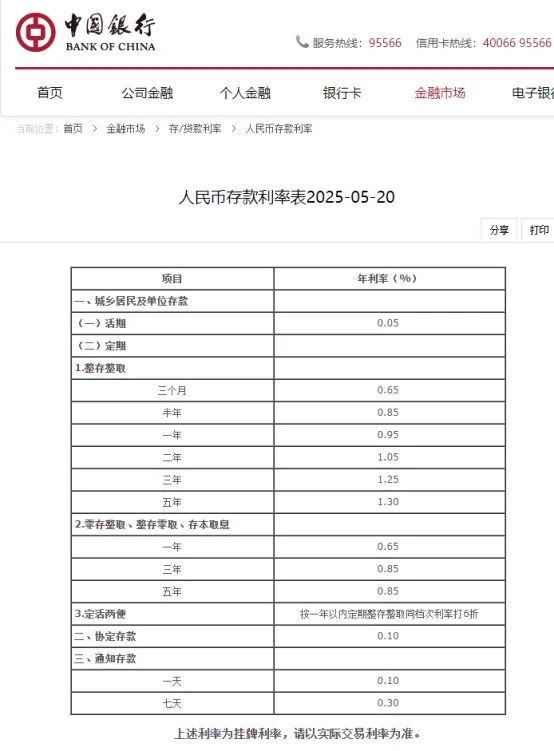 中国银行于5月20日下调人民币存款利率,其中活期利率下调5个基点至0.05%;定期整存整取三个月期、半年期、一年期、二年期均下调15个基点,分别为0.65%、0.85%、0.95%、1.05%;三年期和五年期均下调25个基点,分别至1.25%和1.3%。定期零存整取、整存零取、存本取息三种期限均下调15个基点。7天期通知存款利率下调15个基点至0.3%。