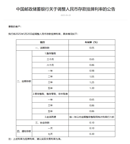 邮储银行20日宣布下调人民币存款利率,其中活期利率下调5个基点至0.05%;定期整存整取三个月期、半年期、一年期、二年期均下调15个基点,分别为0.65%、0.86%、0.98%、1.05%;三年期和五年期均下调25个基点,分别至1.25%和1.3%。定期零存整取、整存零取、存本取息三种期限均下调15个基点。7天期通知存款利率下调15个基点至0.3%。