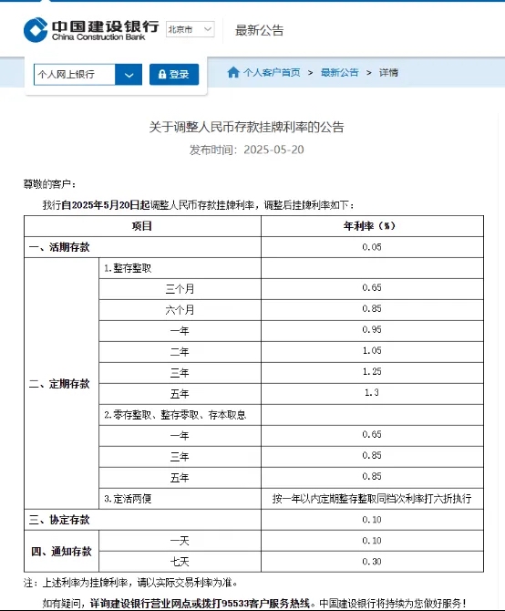 中国建设银行20日宣布下调人民币存款利率,其中活期利率下调5个基点至0.05%;定期整存整取三个月期、半年期、一年期、二年期均下调15个基点,分别为0.65%、0.85%、0.95%、1.05%;三年期和五年期均下调25个基点,分别至1.25%和1.3%。定期零存整取、整存零取、存本取息三种期限均下调15个基点。7天期通知存款利率下调15个基点至0.3%。