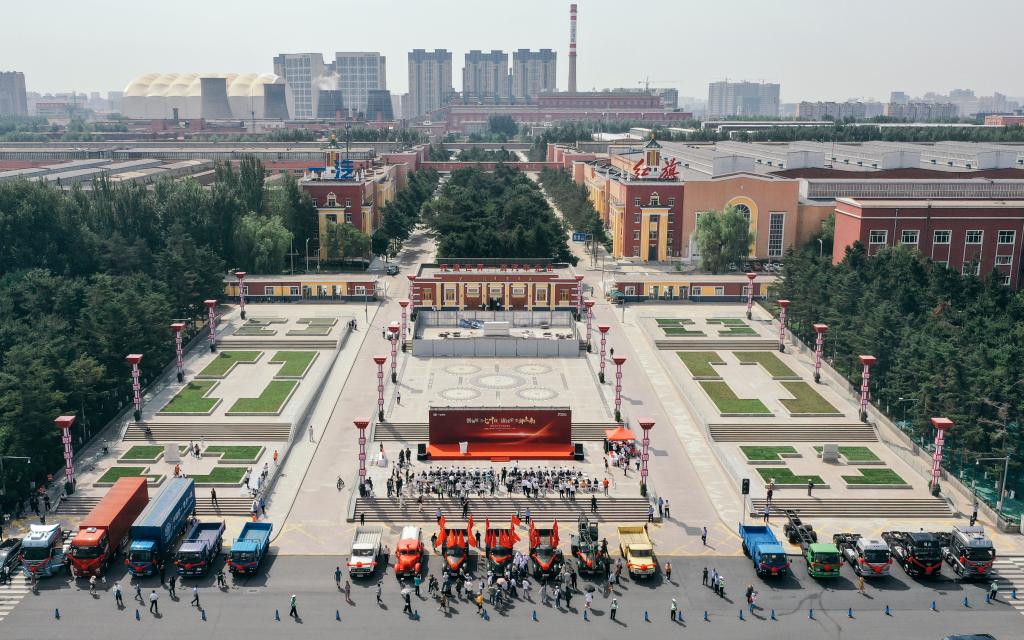 一汽解放卡车在中国第一汽车集团有限公司厂区一号门前进行集中展示(无人机照片)。新华社记者 许畅 摄