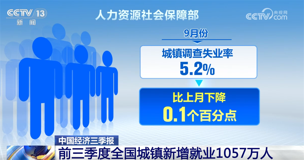 1至9月,全国城镇新增就业1057万人,完成全年目标任务的88%。9月份城镇调查失业率5.2%,比上月下降0.1个百分点。