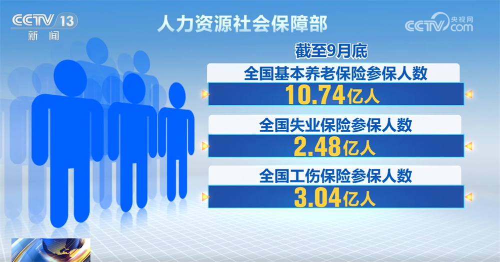 截至9月底,全国基本养老、失业、工伤保险参保人数分别为10.74亿人、2.48亿人、3.04亿人,职业伤害保障试点累计参保人数超过2200万人。全国社保卡持卡人数达13.9亿人,覆盖98.9%的人口,其中11亿人领用电子社保卡。