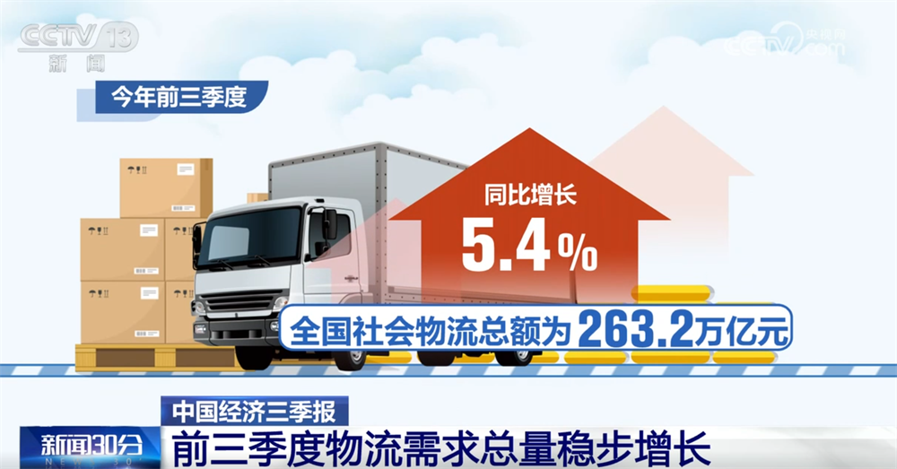 今年前三季度,全国社会物流总额为263.2万亿元,同比增长5.4%。