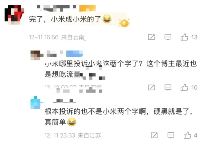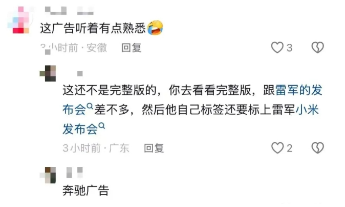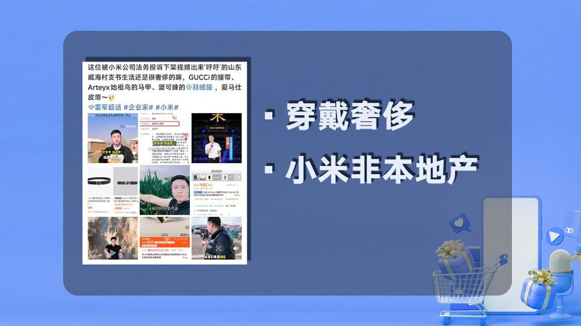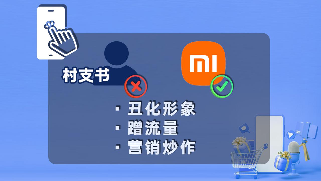 支持小米维权的网民认为,村支书的行为,包括复刻发布会场景、关联企业高管和专属营销符号,带有明显的戏谑态度,是刻意蹭流量的营销炒作。