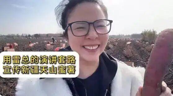 视频里,一个卖蜜薯的新疆姑娘,模仿雷军的发布会风格,一本正经地介绍“年度最硬核农产品”:“甜度流失67.77%”、“10倍烤制工艺”、“618天土壤实验”、“重新定义碳水”。字字带数据、句句有情怀,视频一出,笑翻全网,姑娘三天涨粉68万,红薯销量也翻了20倍。