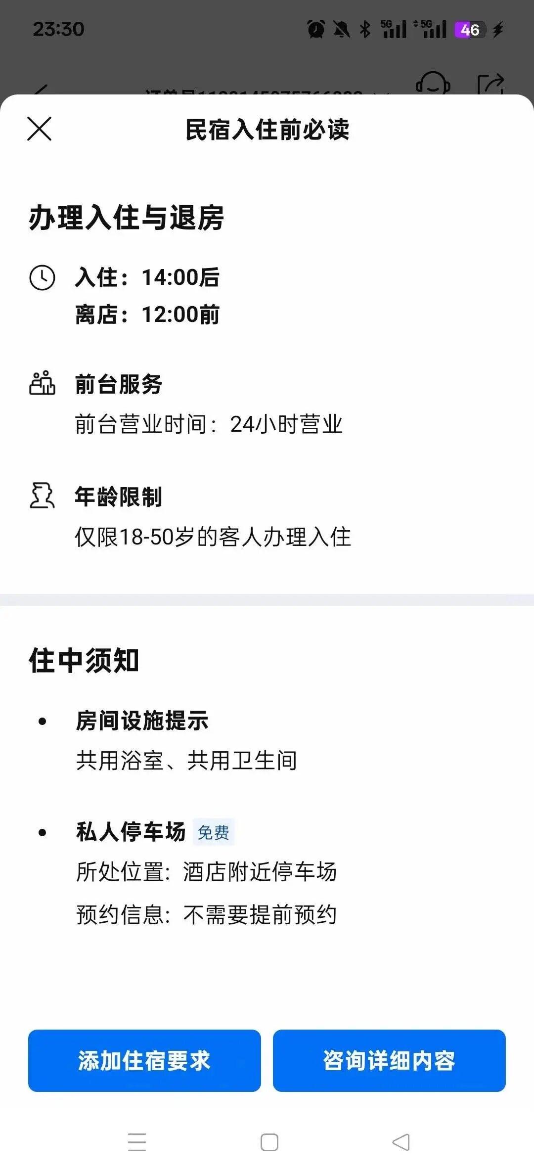 下单成功后,她才收到平台自动弹出的民宿入住前必读,显示该民宿仅限18至50岁的客人办理入住。