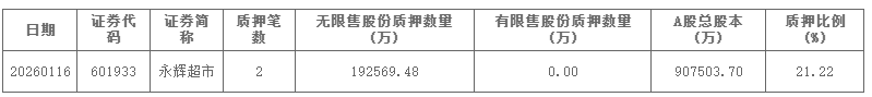 据中登公司数据显示,截至1月16日,永辉超市共有192569.48万股无限售股份已质押,质押比例为21.22%。