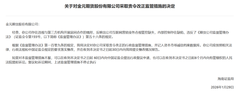1月30日,海南证监局网站公布有关金元期货及该公司相关人员的监管措施。海南证监局指出,经查,金元期货存在违规与第三方机构开展居间合作的情形,反映出公司互联网营销业务合规管控缺失,内部控制存在缺陷。根据相关规定,金元期货被采取责令改正的行政监督管理措施。