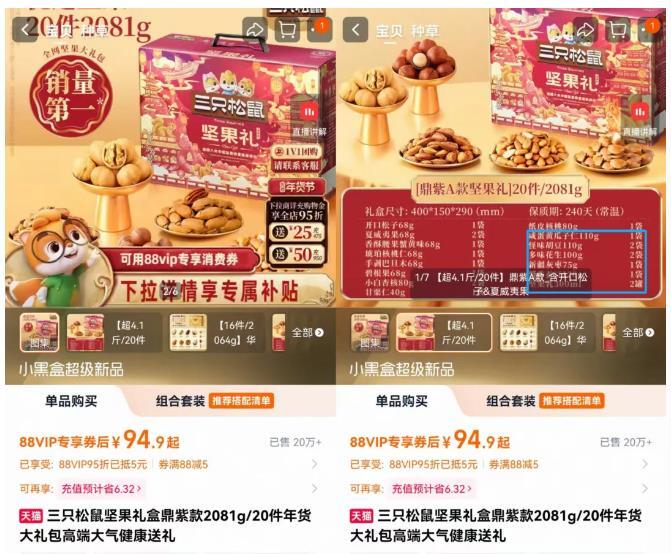 三只松鼠官方旗舰店中的一款重2081克的坚果礼盒,含2罐300ml的坚果乳和其他非坚果零食,坚果类食品总重仅有756克,约占礼盒总重量的36%。商品页面显示,该礼盒在该电商平台已热销20万多件,排名该平台坚果热卖榜第一名。