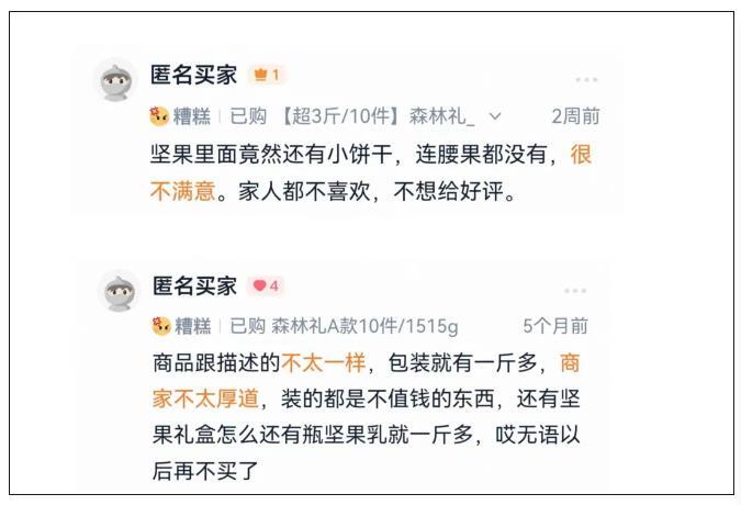 记者浏览商品评价发现,一些消费者收货后才意识到礼盒中含有大量非坚果产品。在网店中,有消费者评价,“好点的坚果少,便宜的花生、青豆多”“一箱里竟有3瓶饮料”“坚果礼盒里还有小饼干”……