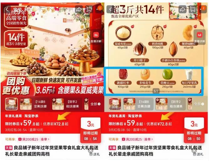 例如,良品铺子官方旗舰店中的一款1800克的坚果零食礼盒,封面宣传“14件,超3斤含8坚果”,然而实际礼盒清单中,各类坚果均为小克重包装,有近70%的重量来自红枣、花生、青豌豆和3瓶坚果乳。