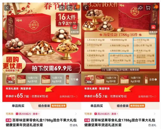 百草味官方旗舰店内一款标重1788克的坚果零食礼盒,其商品首页展示图片上均为坚果,但该礼盒实则有1248克、近70%的重量来自坚果植物蛋白饮料、果冻爽和灰枣等非坚果产品。