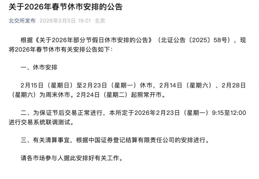 此外,为保证节后交易正常进行,北交所定于2026年2月23日(星期一)9:15至12:00进行交易系统联调测试。