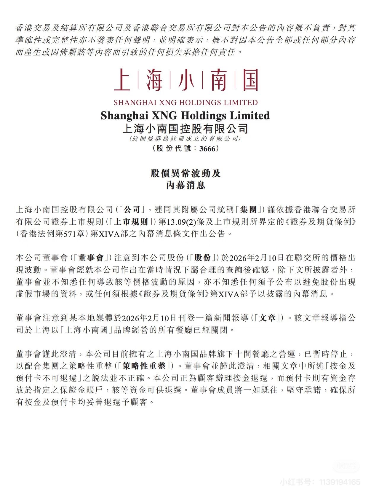 2月10日,上海小南国控股有限公司(股票简称:上海小南国)的股价报收0.025港元/股,单日跌幅为28.57%,公司总市值约6639.1万港元。当日晚间,上海小南国发布公告称,公司目前拥有的上海小南国品牌旗下十间餐厅暂时停止运营,意在配合集团的策略性重整。上海小南国表示,相关文章中所称“押金及预付卡不可退还”的说法不正确,公司正为顾客办理押金退还,而预付卡则有资金存放在指定的保证金账户,可供退还。