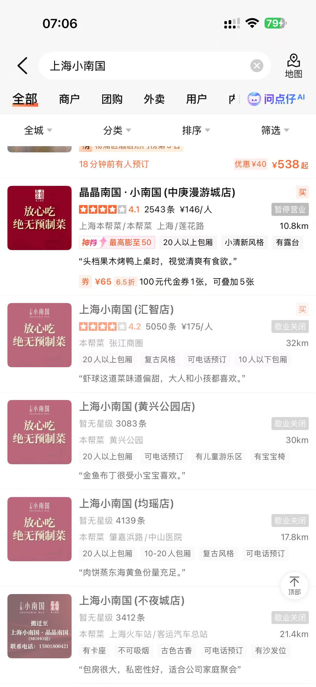 2月10日,上海小南国各门店均显示已停业。大众点评截图