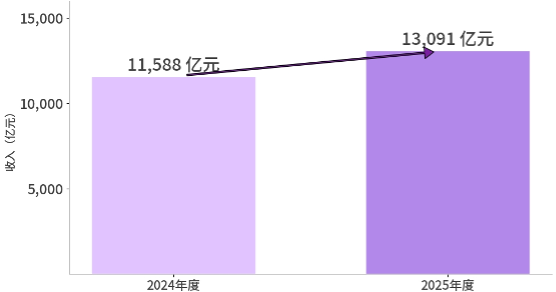 2025年全年,京东集团总营收达13091亿元(约合1872亿美元),同比增长13.0%。具体来看,带电品类市场受高基数影响保持全年收入同比增长7.1%;日百品类连续5个季度双位数增长,全年收入同比增长15.3%,占商品收入比例超四成创年度新高,商超品类已实现连续8个季度双位数增长;服务收入全年同比增长23.6%,占收入比例达到21.8%创年度新高。
