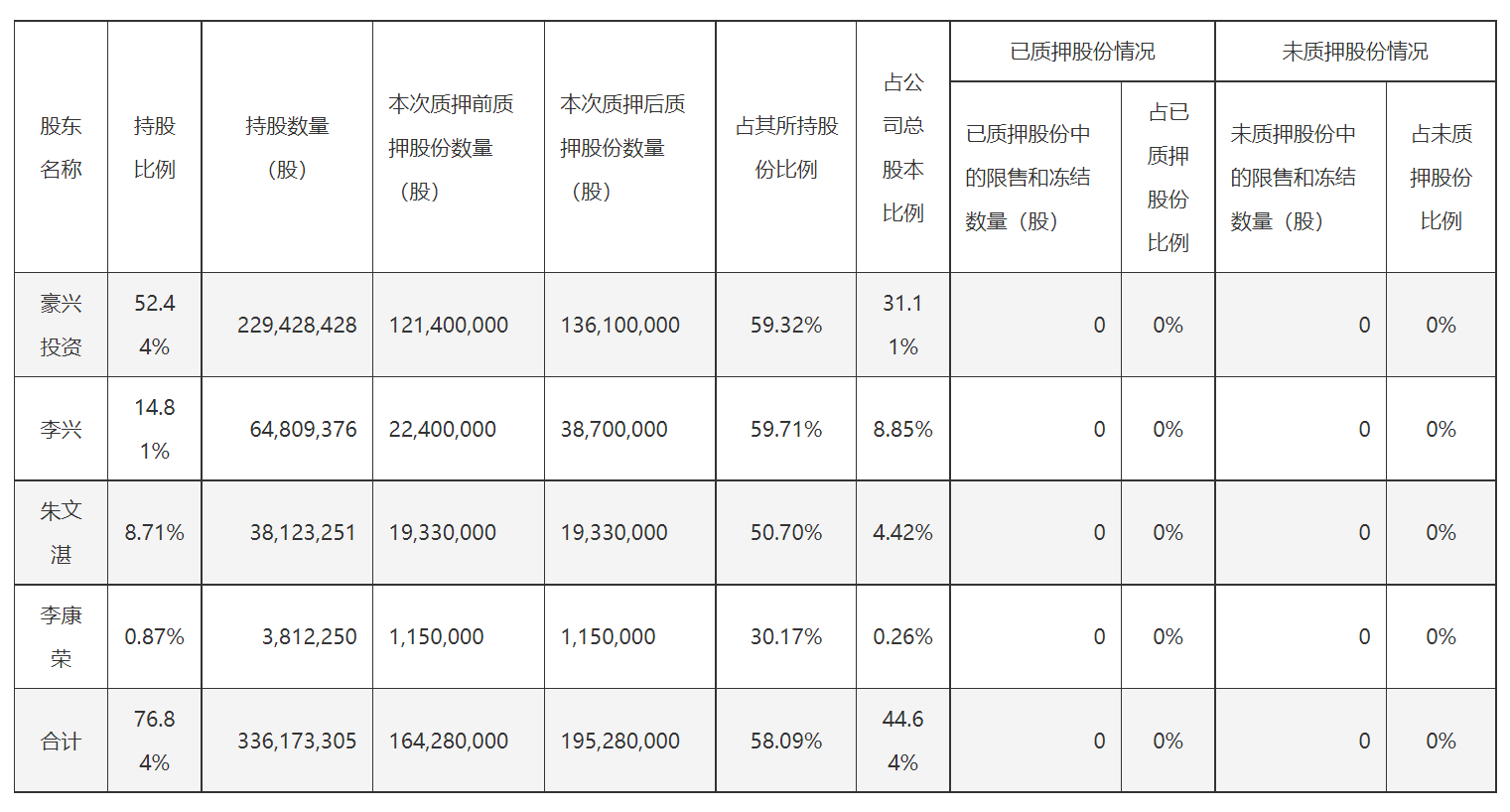 截至2026年3月9日,豪兴投资、李兴、朱文湛、李康荣合计的质押比例为67.01%。
